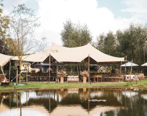 Je vindt hun snelgroeiende verhuurbedrijf vanBos | Buitengewone Momenten tussen de weilanden en boerderijen in het buitengebied van Barneveld, waar meerdere loodsen volliggen met event equipment. Aluminium tenthallen en pagodetenten. Metershoge stapels met vloerdelen en vlonders. Haringen die meer dan een meter de grond in gaan. En heaters, meubilair en servies zover het oog reikt.